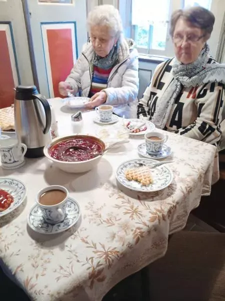 Danach ging es zum Waffelessen ins „Dat ole Hus“. Während des Waffelessens kam unser „Überraschungsgast“, unser Bürgermeister. Er hatte zur Begeisterung aller seine beiden Greifvögel, einen Falken und einen Rotschwanzbussard, mitgebracht und erklärte uns vieles zur Haltung, zur Pflege und zum Jagdverhalten der Vögel. Es war ein Erlebnis, diese wunderschönen Vögel so nah zu sehen.